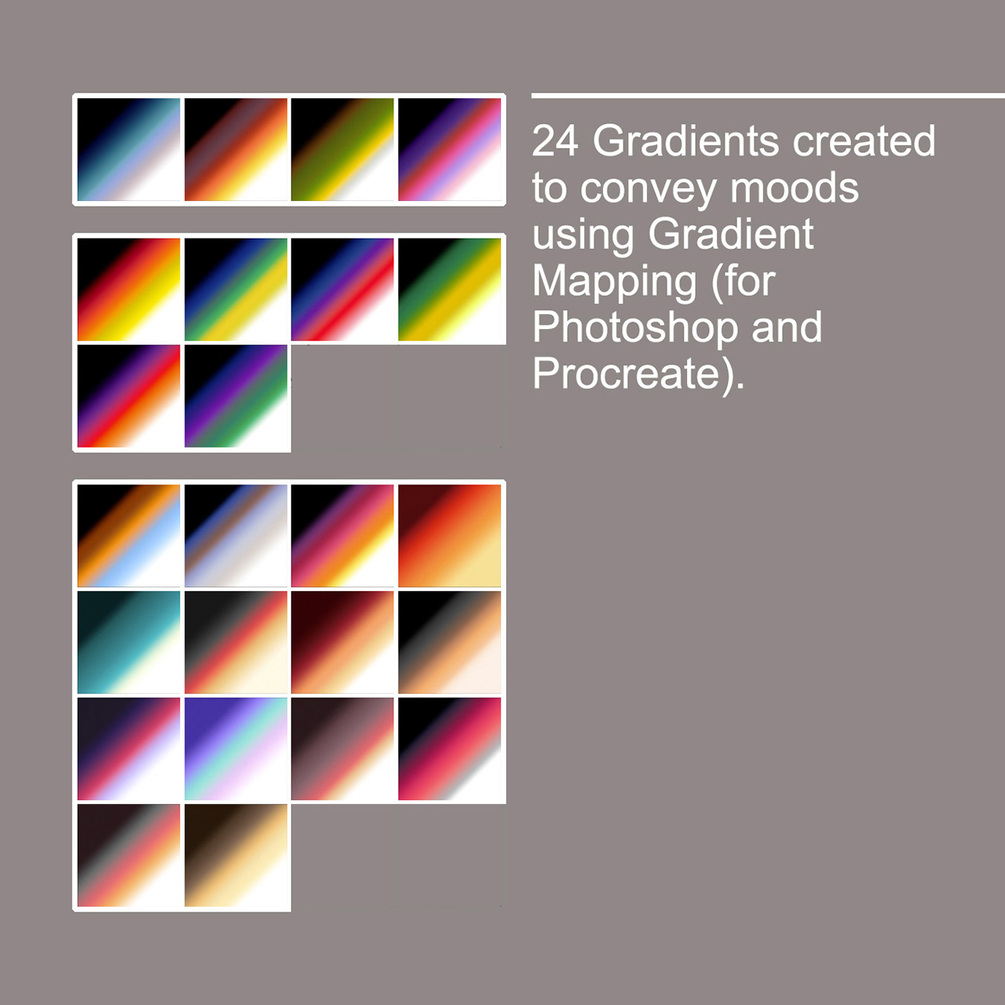 The "Mood Gradients Pack" contains 24 gradients created to be used as "Gradient Maps" in Photoshop, to convey moods. They're inspired by the seasons, Goethe's Psychology of Colors and other various moods.